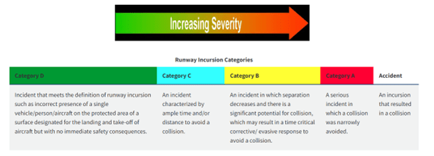 - Category D: Least severe — meets the definition of an incursion but with no immediate safety consequences.