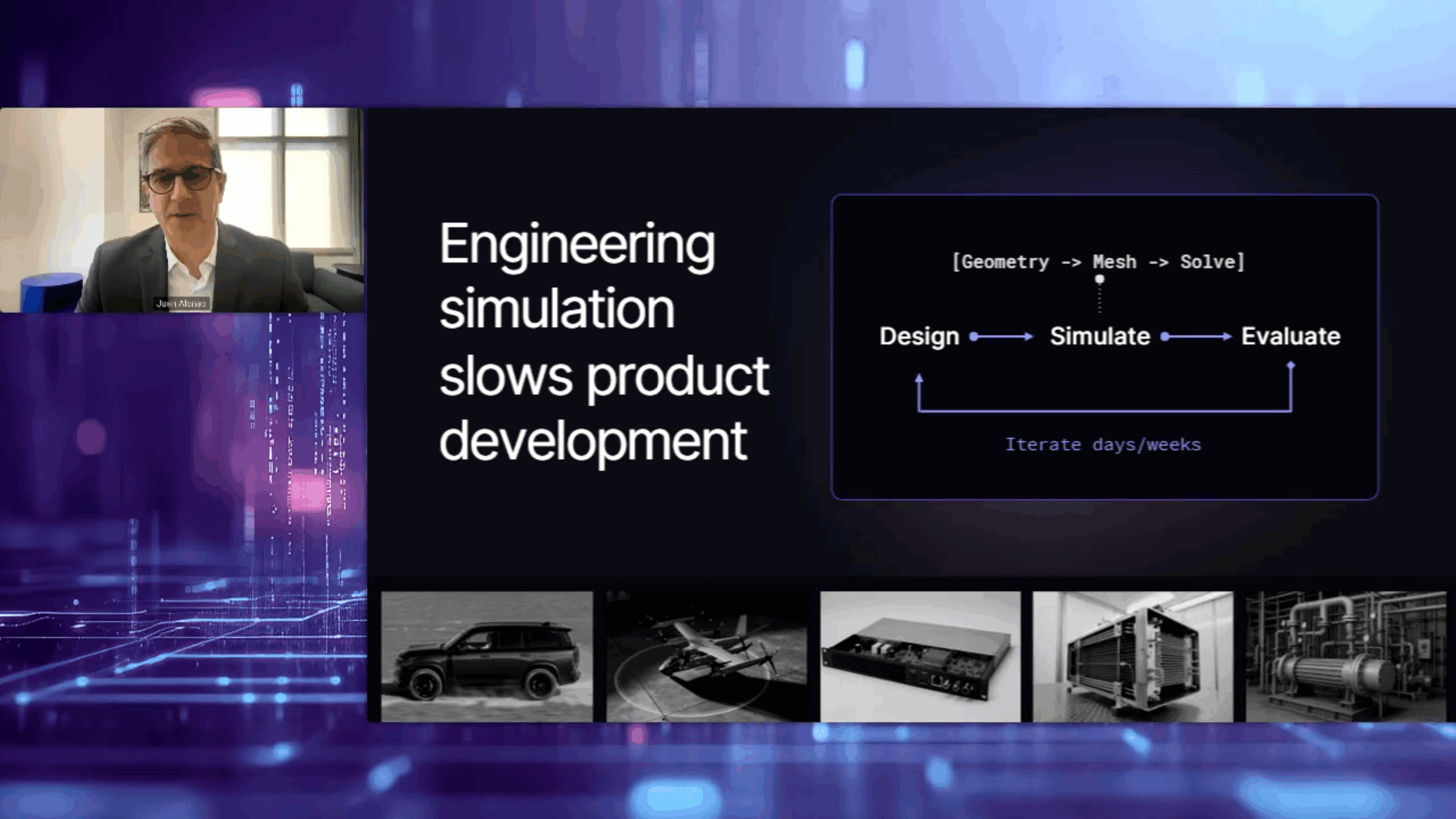 Riippi showed an alternative path to faster and more accurate simulation than the AI approach of other developers. He demonstrated the benefits of multiphysics solvers written for a scalable cloud architecture, and teased an even more interesting approach that his company is exploring: quantum simulation.