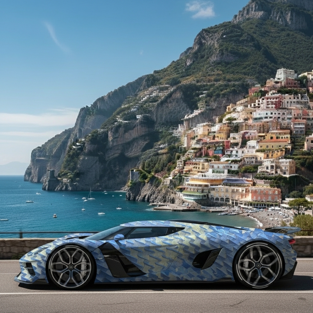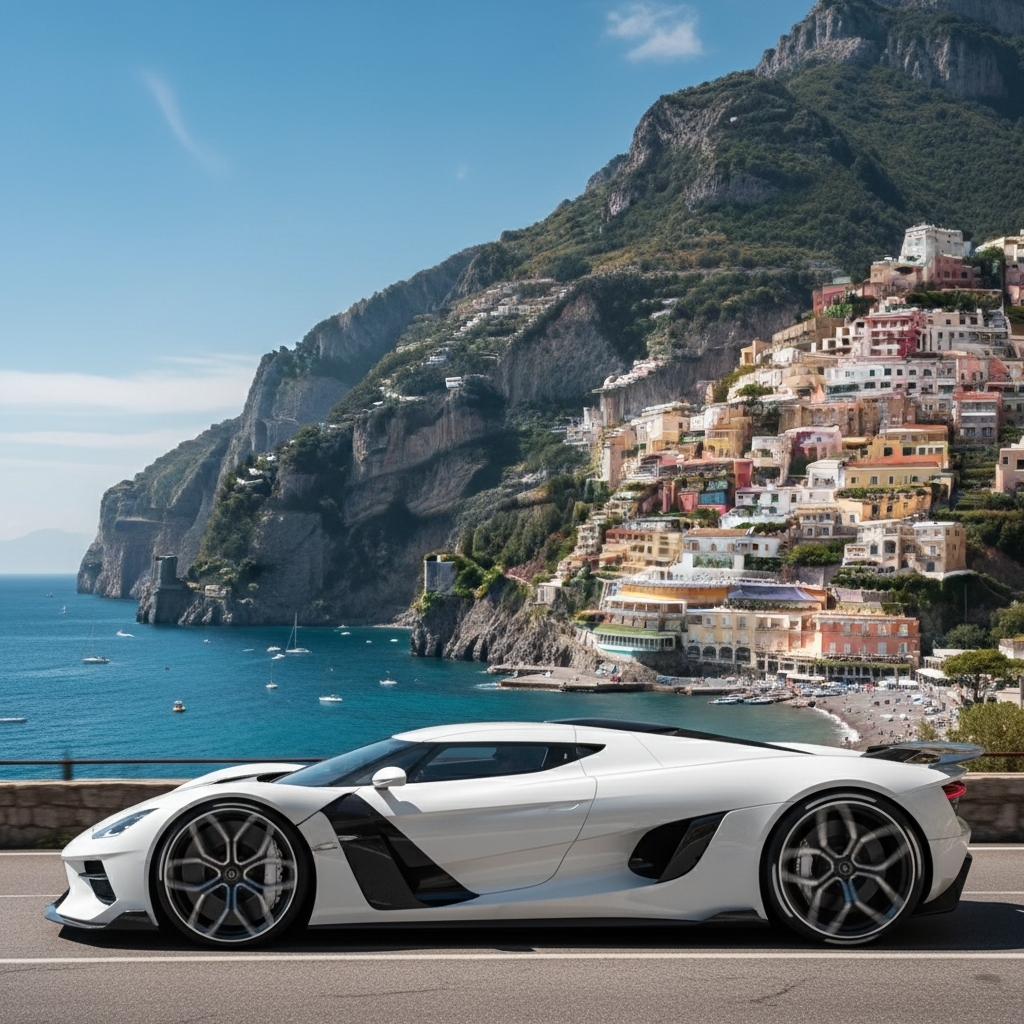 Prompt (added automatically): Place this car on the Amalfi Coast in Italy with dramatic coastal cliffs, Mediterranean sea views, colorful Italian villages, and coastal road atmosphere while adhering to the shape and position of the car as close as possible while adhering to the original image