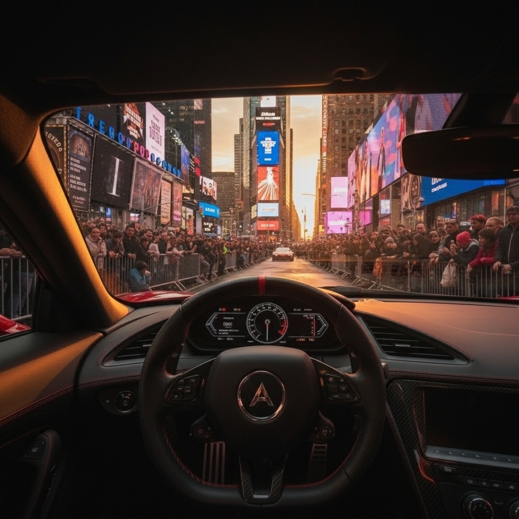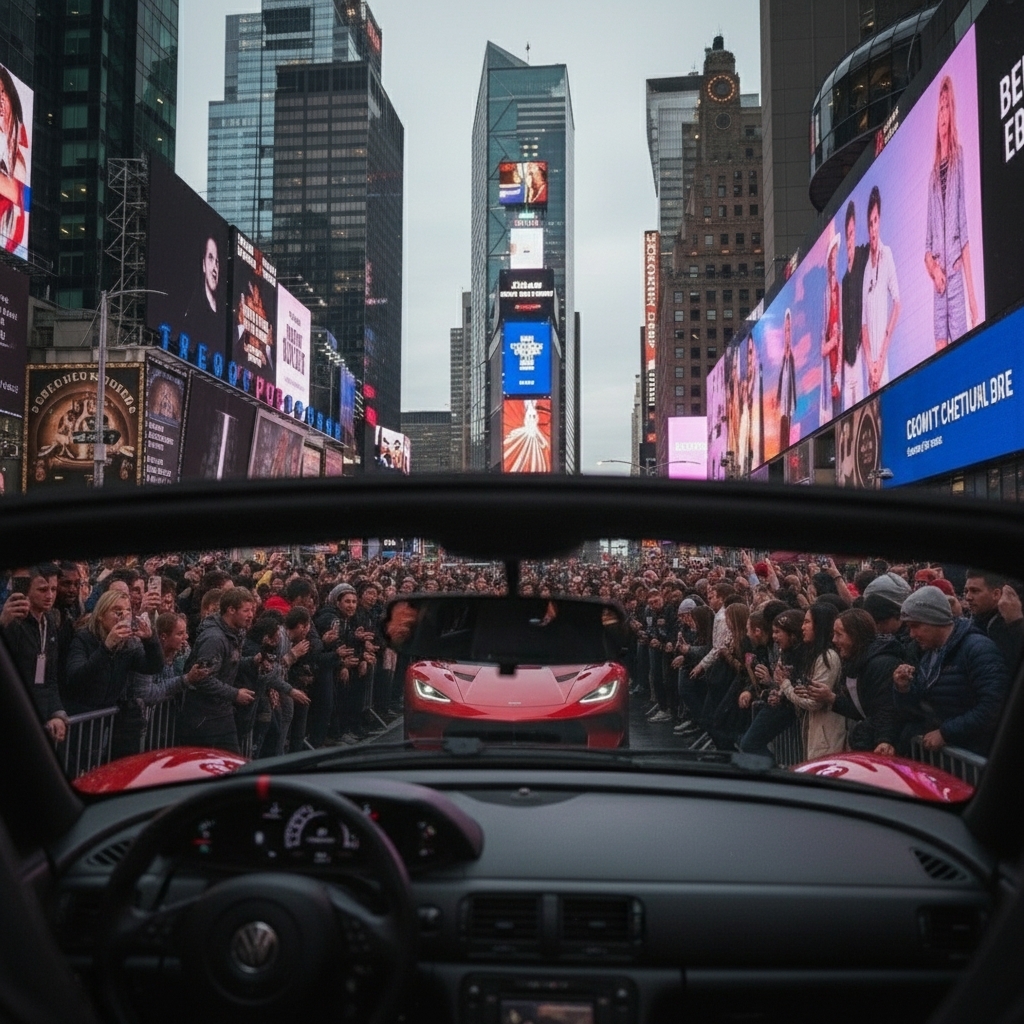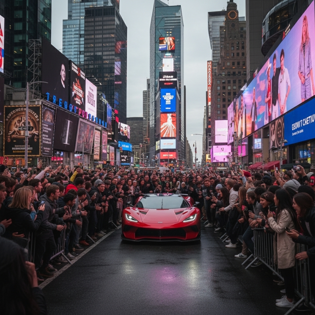 Prompt: Change the background to Times Square, and put a crowd of gawking admirers around the car. And change the color of the car to red.
