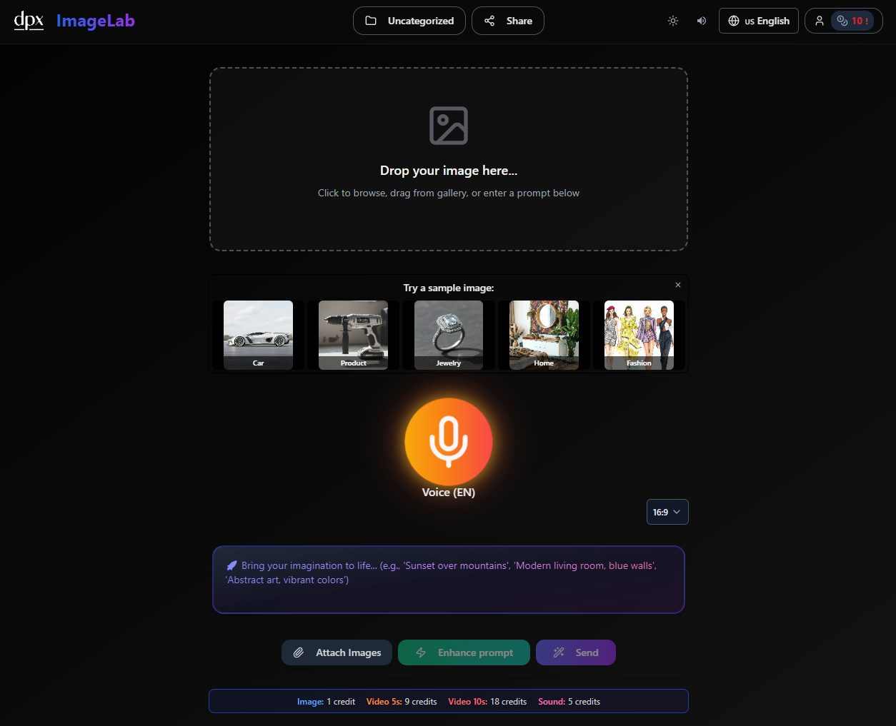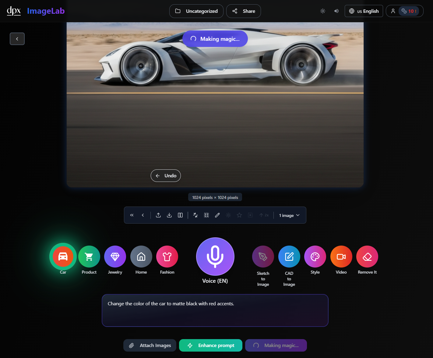 The interface is self-explanatory. You start by importing an image (or picking a sample), and then you tell ImageLab what to do to it. If you don’t feel like typing a prompt, you can hit the glowing Voice button to dictate one instead. You can also attach other images to reference in your prompt, like an image of a texture you want to apply to the target image (we’ll show an example of that later).