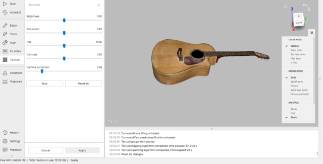 Now we’re ready to remove the extraneous detail from our scans—namely, the carpet. Artec Studio provides a set of handy editing tools, including an eraser, which we’ll use to isolate the guitar in both of our scans.