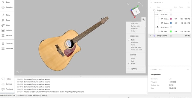 Note that the 3D resolution is limited by our 3D scan error rate, an internal parameter which is shown in the object panel on the right of Artec Studio. The higher the scan error rate, the coarser we must set our mesh resolution (Artec provides a table matching error rate to mesh resolution, though as of writing it does not include the Leo nor HD Mode). For the guitar, the max error rate was 0.4, so I selected a mesh resolution of 0.5mm.